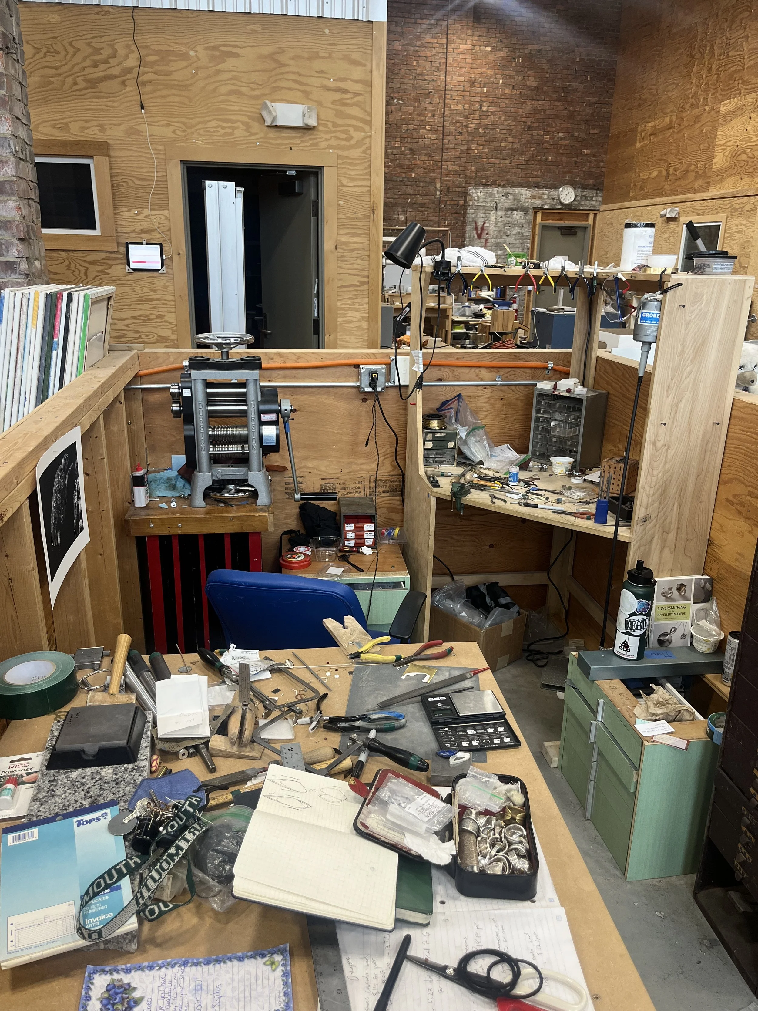Theodore is a jeweler, commercial fisherman, and musician from Homer, Alaska and currently works in the upper valley area of Vermont and New Hampshire. After working for three years at the Dartmouth Jewelry Studio and graduating in the spring of 2024 with a biology degree, Theodore was hired by a local goldsmith named Paul Gross, and currently works as a bench jeweler at his studio, Designer Gold. In addition to his work for Paul, Theodore is the jewelry studio shop lead for the Claremont Makerspace in Claremont, New Hampshire, where he has a small personal studio space (pictured right), and teaches silversmithing classes out of the makerspace’s larger studio.